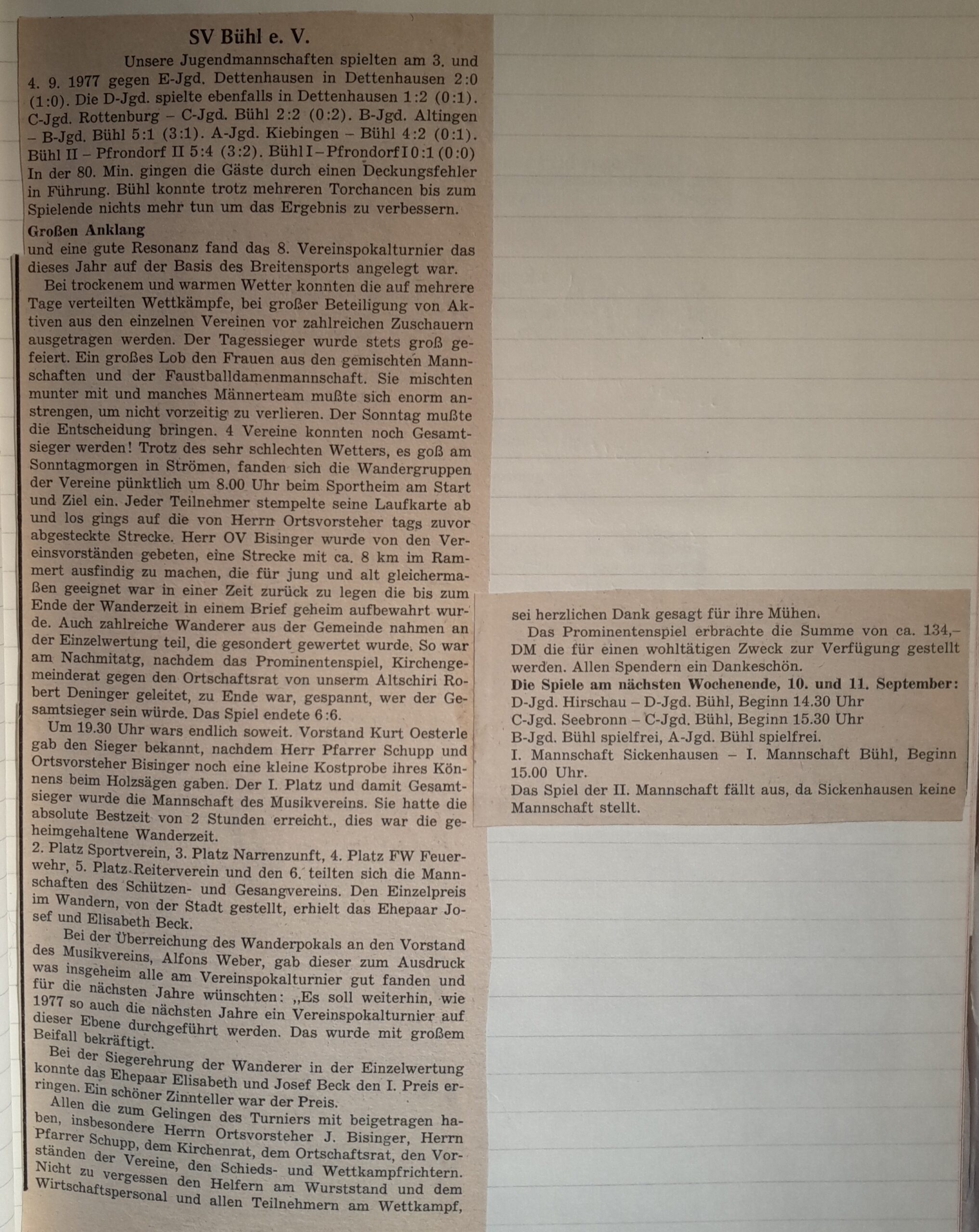 Beim 8. Vereinspokalturnier vom 31.08. bis 4.9.77 wird nicht mehr Fußball gespielt, da es einfach zu viele Verletzte gab. Künftig messen sich die Bühler Vereine eine ganze Woche lang in verschiedenen Disziplinen wie Bocccia, Steinstoßen, Holzsägen, Faustball, Wanderung.